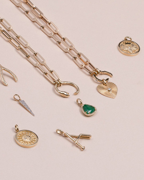 Modern and timeless diamond emerald in a free form shape pendant available in 14k solid yellow gold. Wear it up or down, they'll be your new favorite piece.