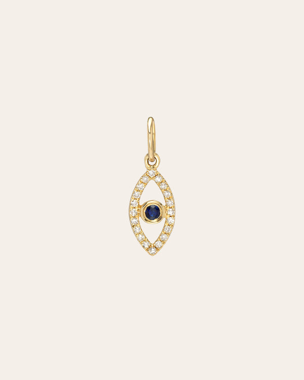 14K solid gold diamond evil eye with a center blue sapphire stone charm, so fun and electric, wear it by itself or as a charm addition to your necklace for a modern and edgy look.