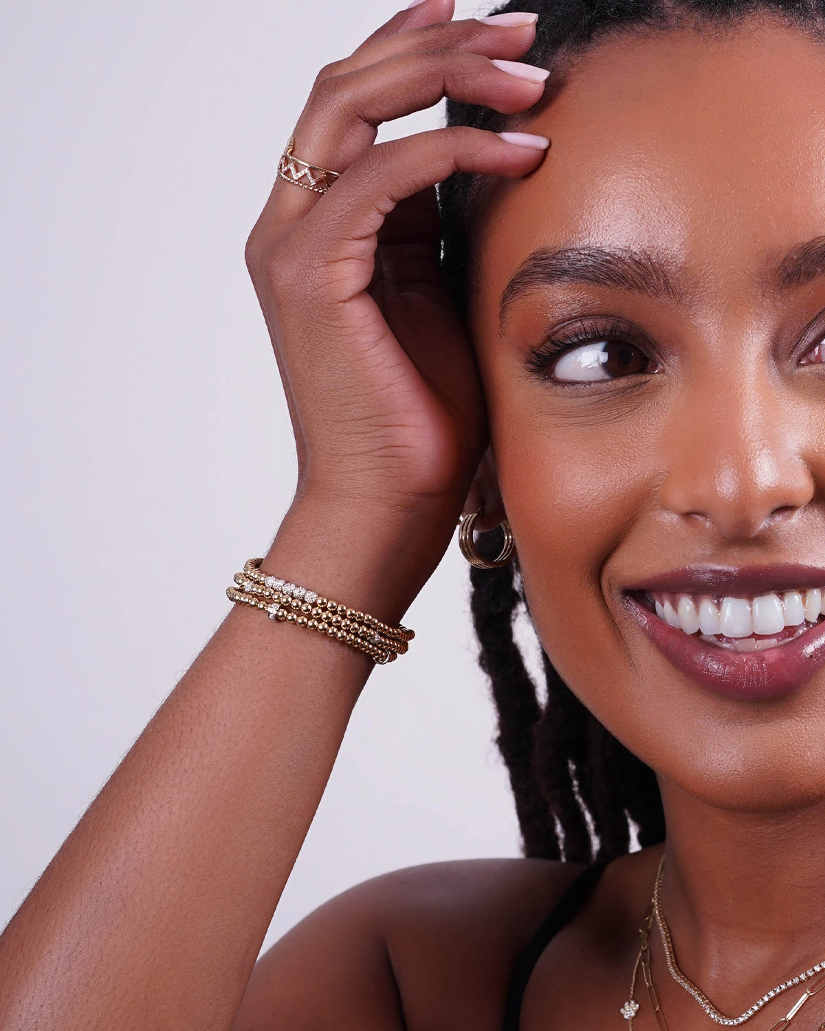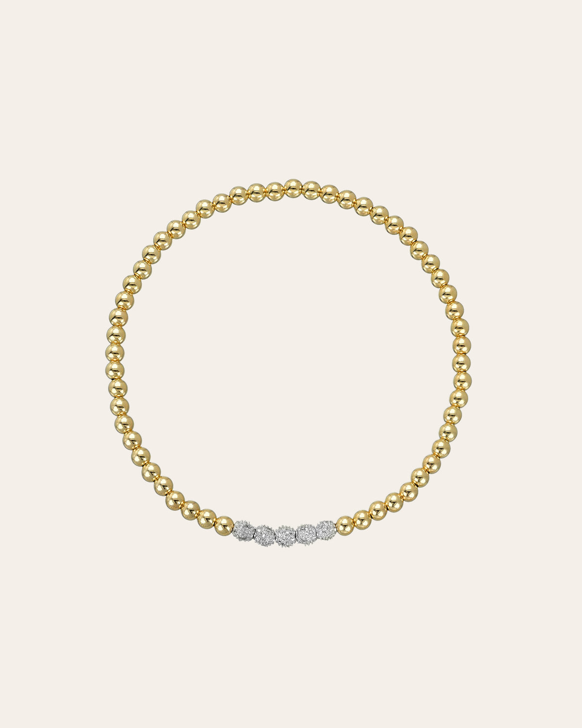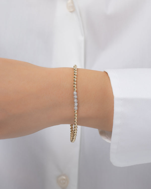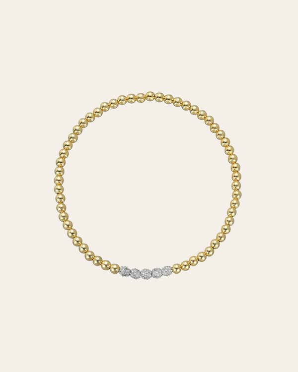 Part of our bead collection, is this fun and chic 3mm gold bead bracelet with 5 14k white gold diamond bead. With an elastic stretch fit, wear it up or down by itself or stacked with your other fine and fashion bracelets for the perfect arm part.