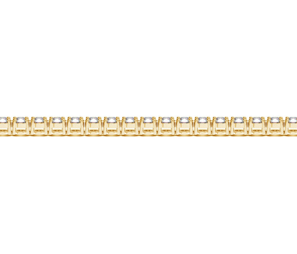 Classic four prong 6 carat total weight diamond tennis bracelet showcasing perfectly matched brilliant round cut lab grown diamonds set in 14k yellow gold.