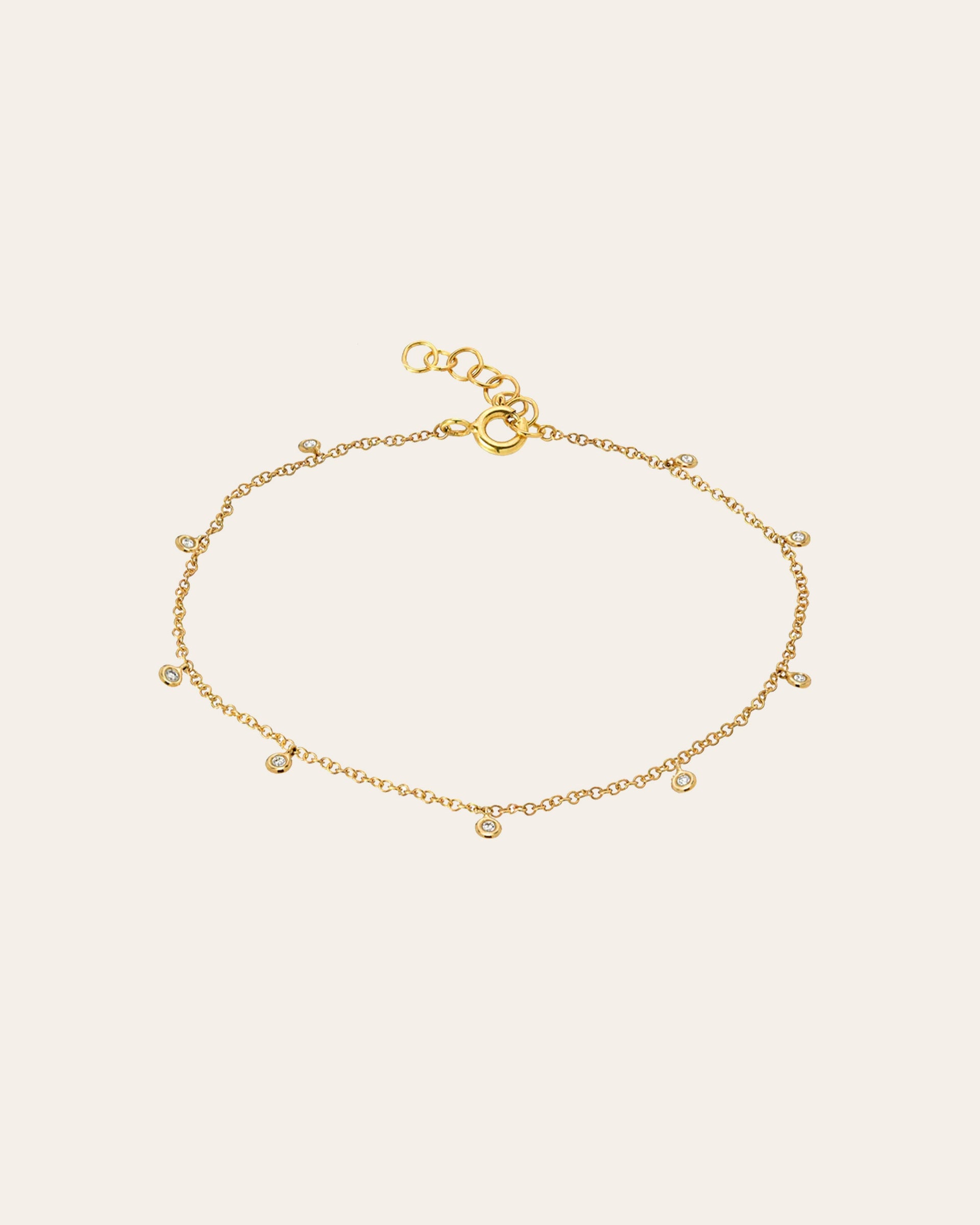 Beautifully handcrafted 14k solid gold anklet with approx. 9 fringe mini bezel diamonds on a dainty cable link chain anklet adjustable 9"- 10", available in 14k yellow, white and rose gold, uber chic and timeless accessory.