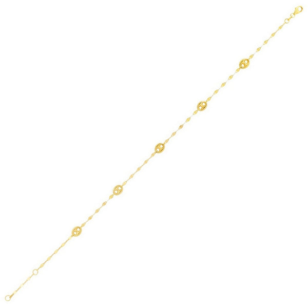 14K Yellow Gold Mirror Chain and Puffed Mariner Station Anklet featuring a reflective mirror-link chain accented with polished puffed mariner stations. Crafted in solid 14K yellow gold, this anklet offers a sleek, modern shine with a lightweight, elegant look perfect for everyday wear.