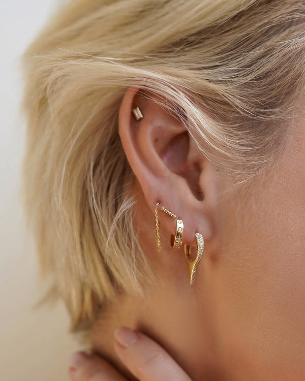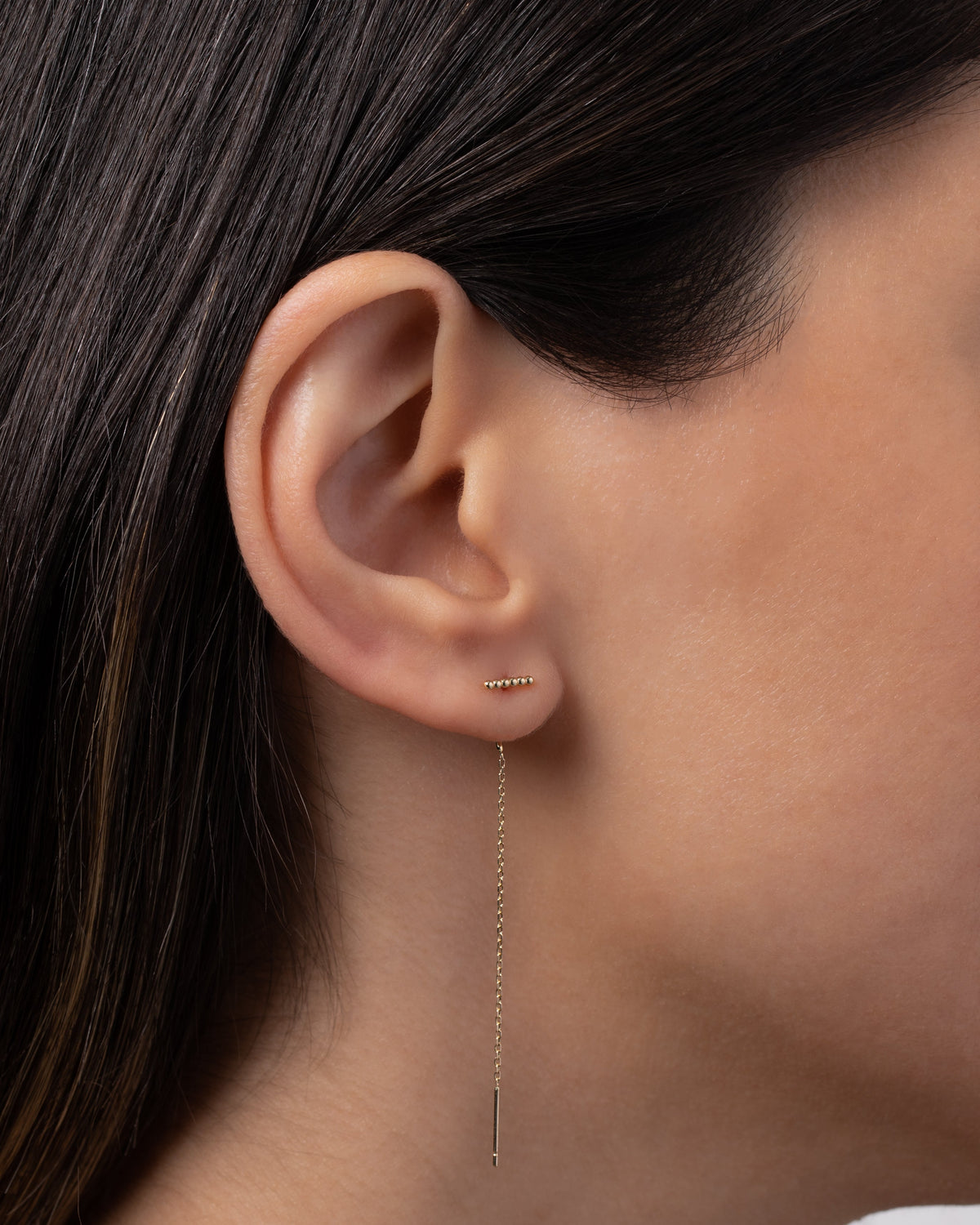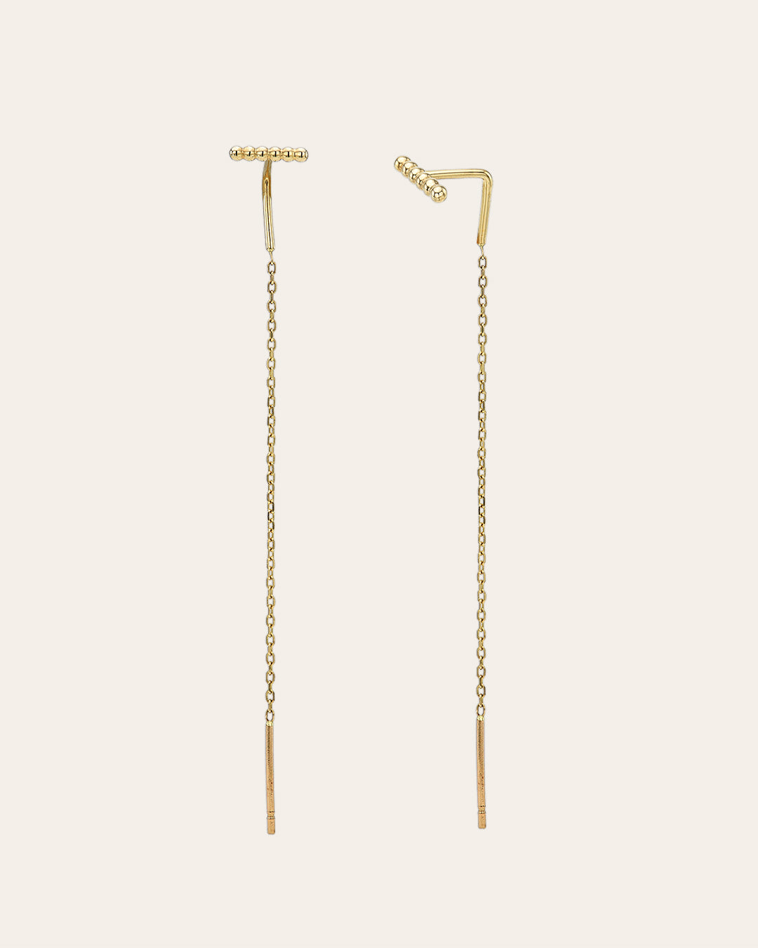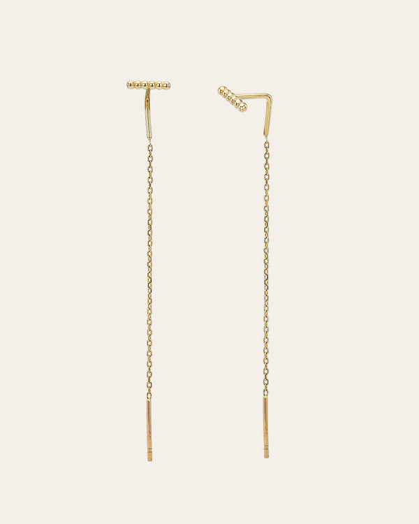 Dainty 14k solid yellow gold bar threader earrings—just thread the cable link through your ear for a lux, minimalist look. No backings required. These day or night earrings are a classic, timeless addition to any look.