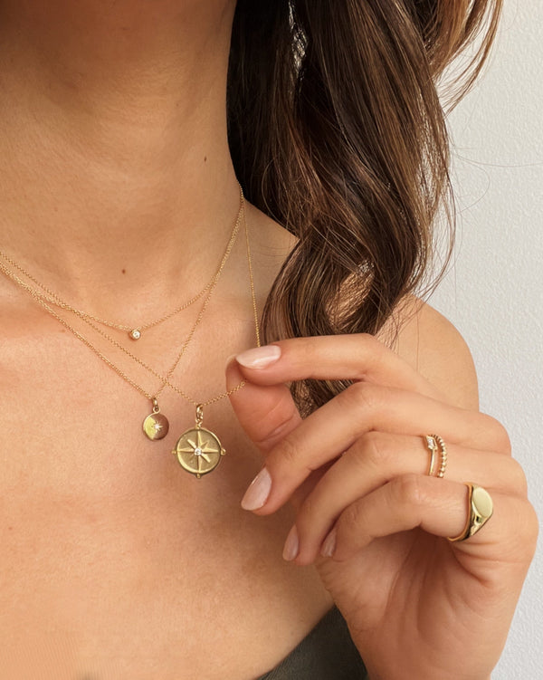 14k gold compass medallion necklace in the gold color of your choice.