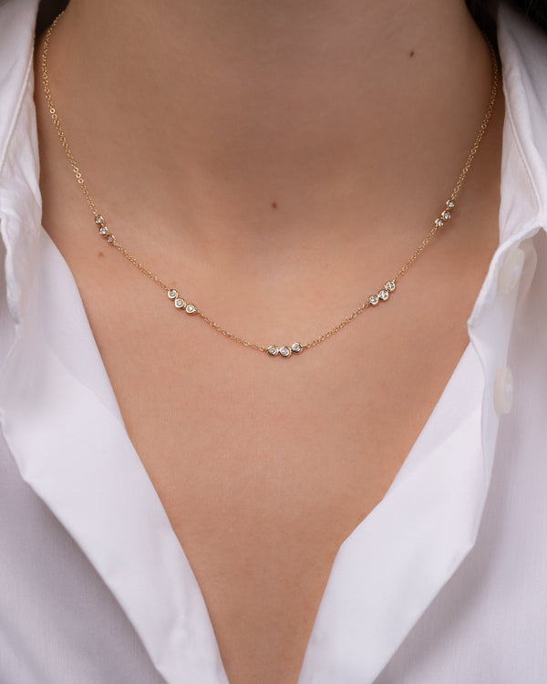 14k solid yellow gold necklace with 15 bezel diamonds hanging around the neck line. Uber chic and dainty, wear it by itself or layered. Comes with a 14''-16'' adjustable chain.
