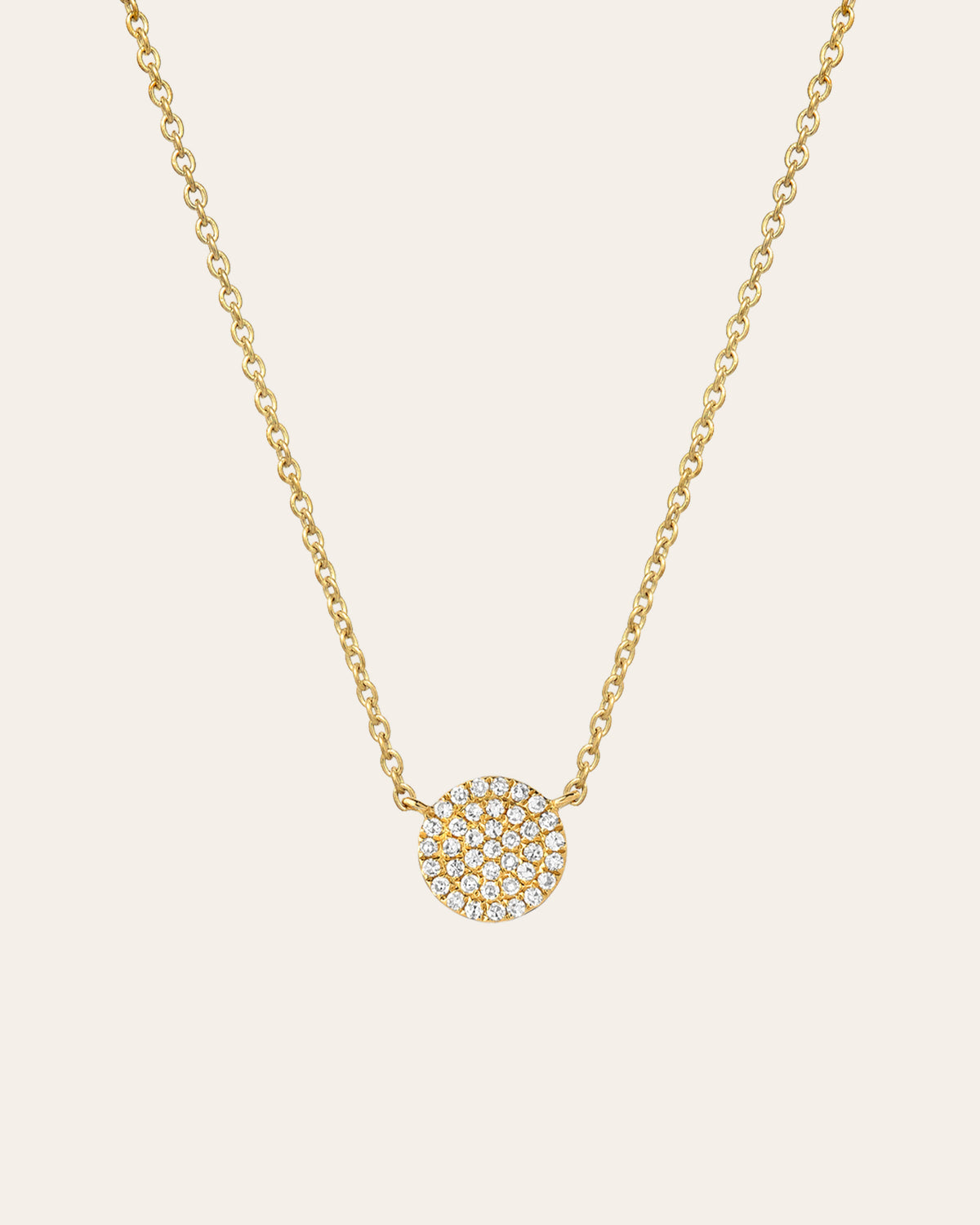 14k solid gold and pave diamond disc on an adjustable 16''-18'' dainty cable link chain, in your choice of yellow, white, and rose gold. Dainty and perfect by itself or layered, wear it day or night, up or down.