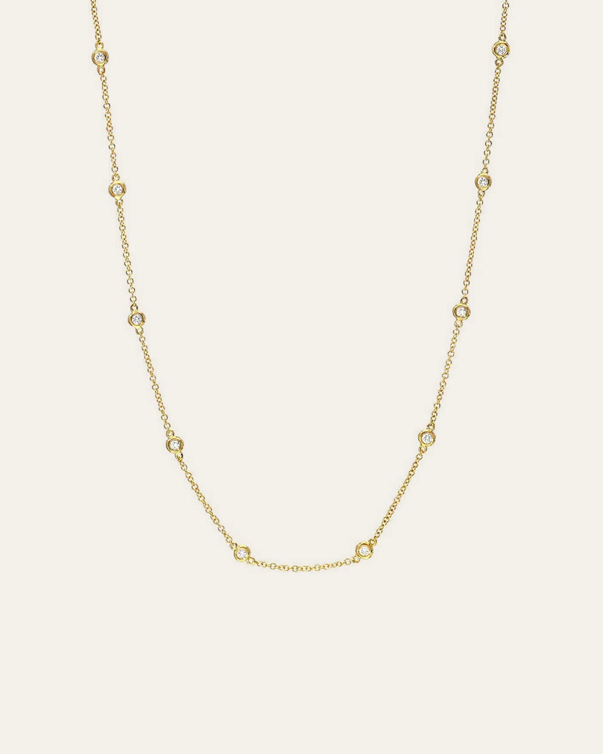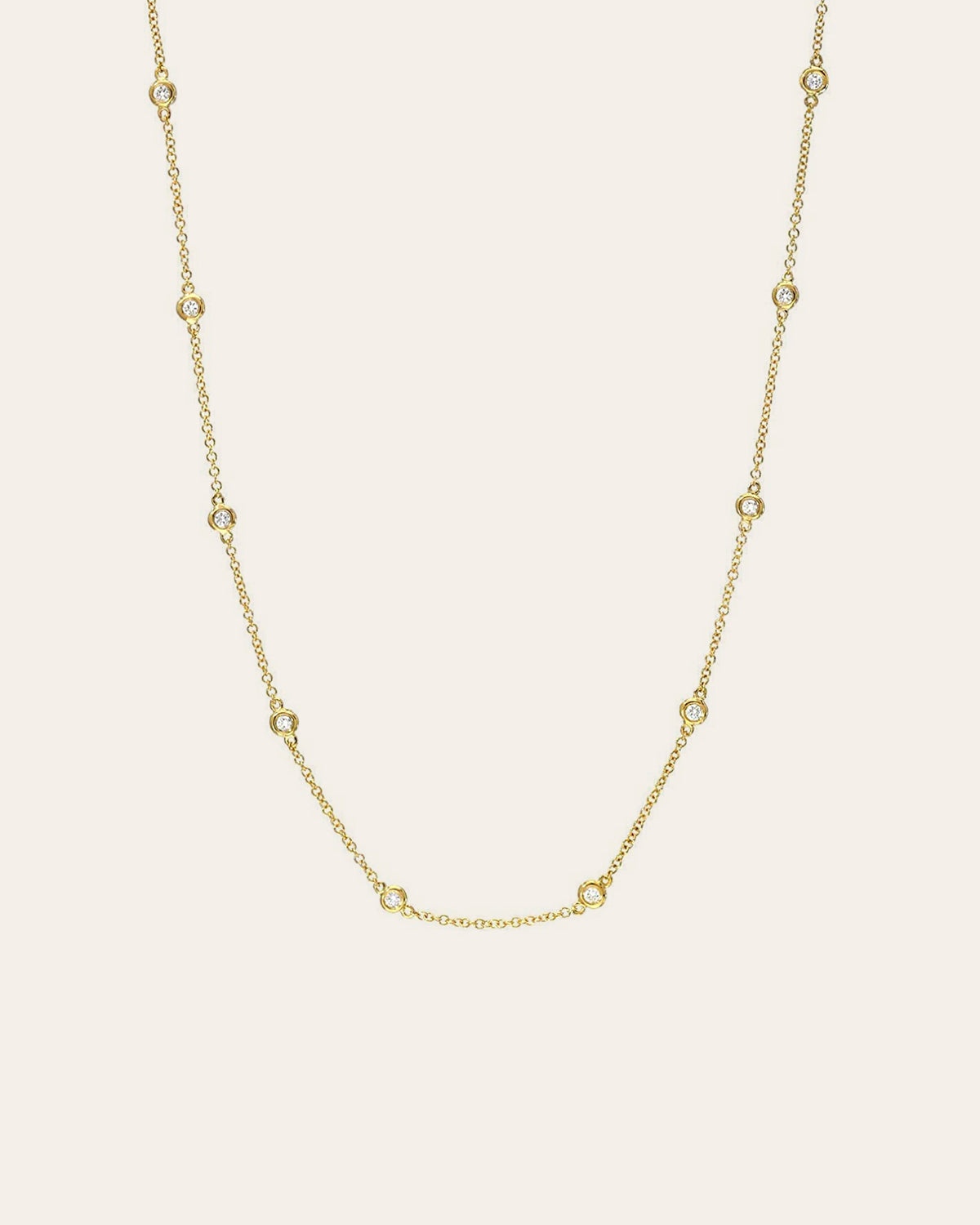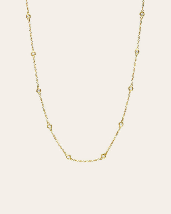 14k solid gold necklace with 10 bezel diamonds around the neck line. Uber chic and dainty, wear it by itself or layered. Comes with a 16"- 17" -18" adjustable chain, and available in 14k yellow, white, and rose gold.