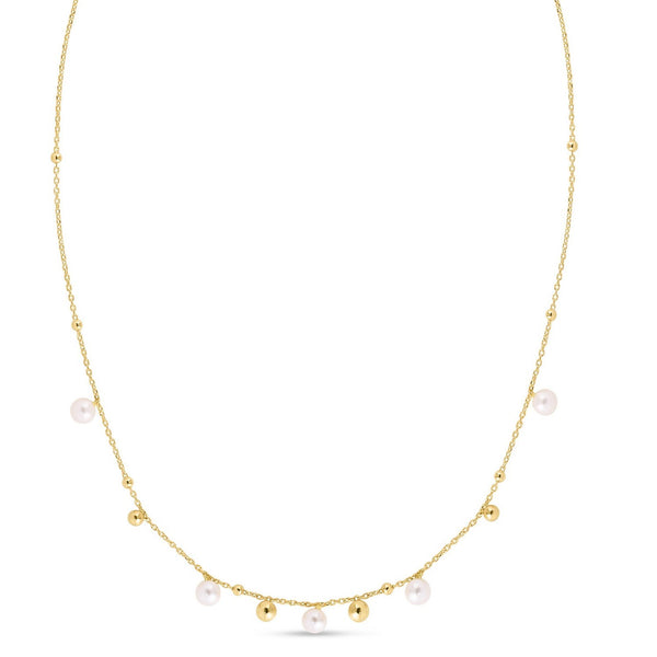 This 14K yellow gold pearl and scattered bead necklace features a lustrous pearl accented by polished gold beads along a delicate chain. Its elegant, timeless design adds a refined touch to everyday looks and makes a beautiful piece for layering or gifting.