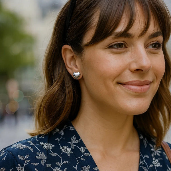 Adorable sterling silver rhodium plated puffed small heart stud earrings featuring a smooth, polished finish for a radiant shine. The puffed heart design adds a touch of sweetness and elegance, perfect for everyday wear or gifting with love.