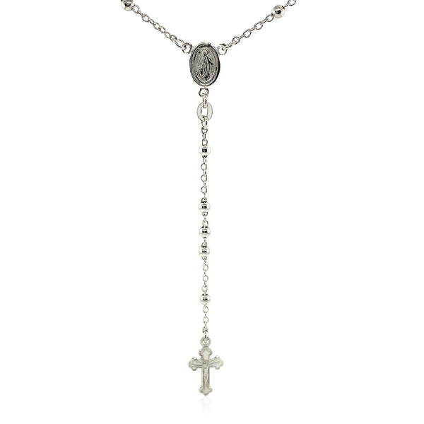This elegant sterling silver rosary necklace features an elegantly decorated crucifix and fine, polished beads. Necklace is 26 inches long.