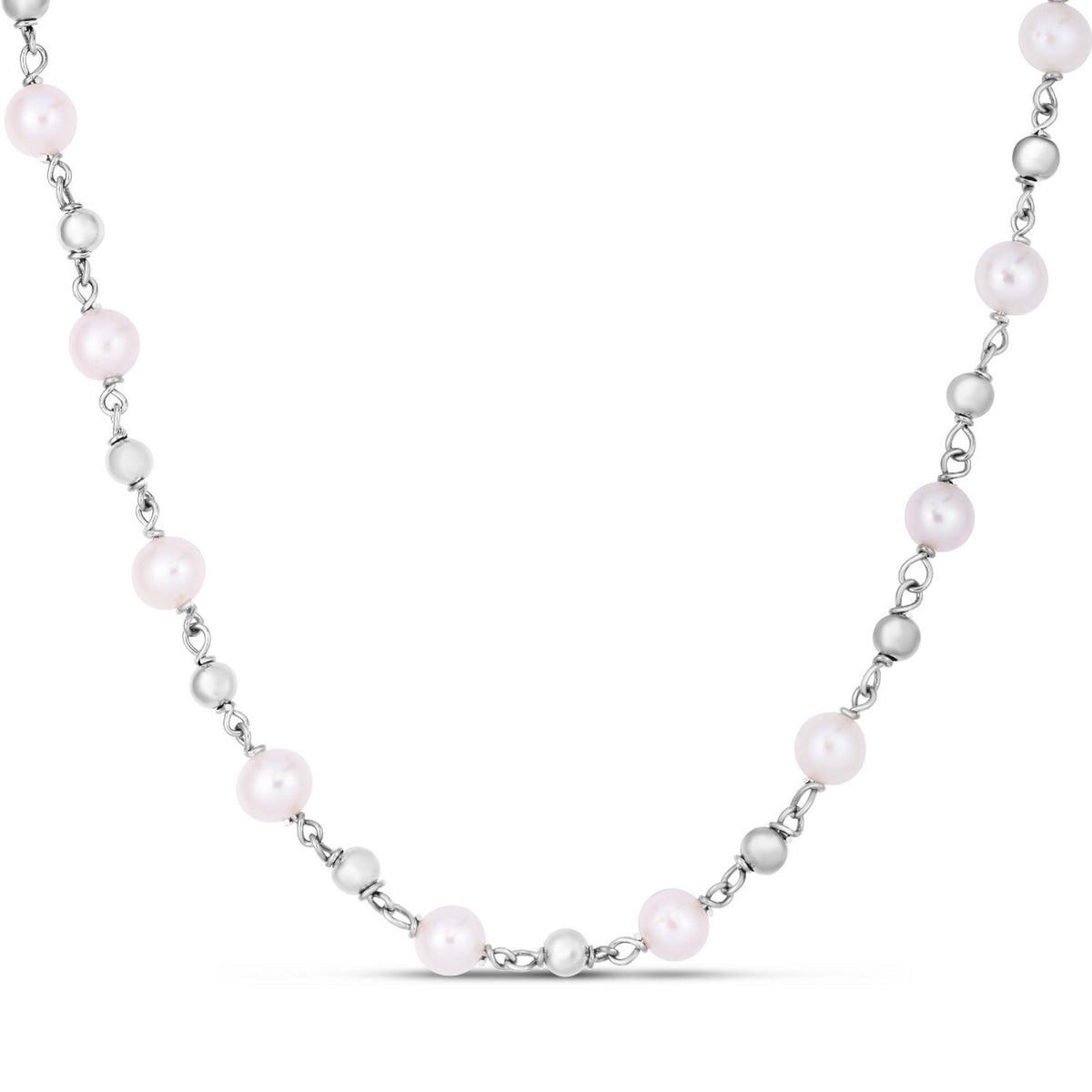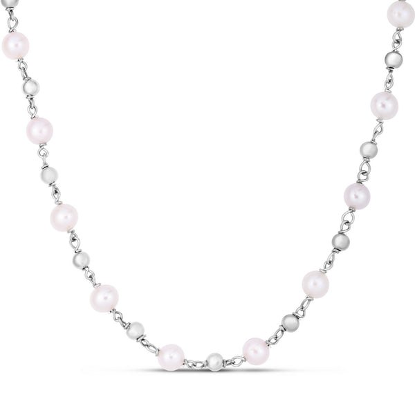 This necklace blends classic elegance with modern shine, featuring lustrous freshwater pearls accented by rhodium-plated sterling silver beads. Its refined, timeless design makes it a versatile piece for both everyday wear and special occasions.