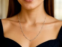 This 14K white gold Saturn bead chain necklace features evenly spaced polished beads along a sleek, shimmering chain. Its modern yet delicate design makes it perfect for everyday wear, layering, or adding a touch of refined sparkle to any look.